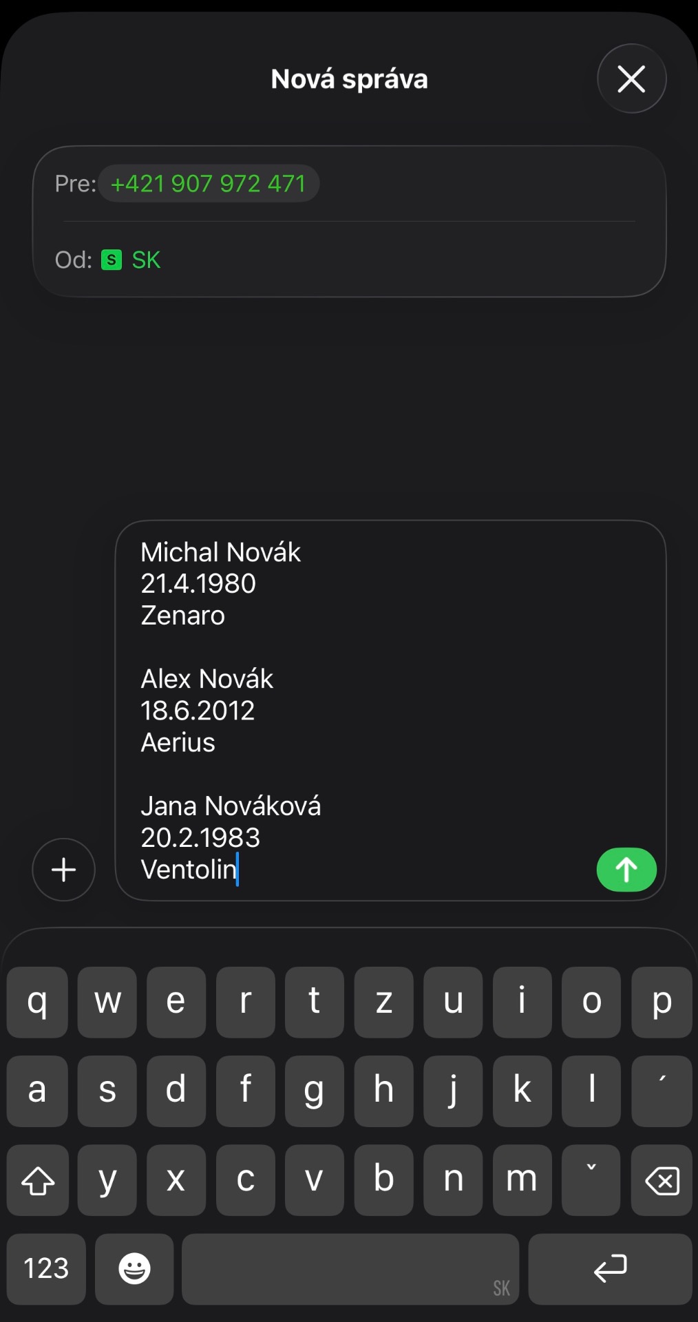 1. NA TELEFÓNNE ČÍSLO 0907 972 471 POŠLITE JEDNU SMS, V KTOREJ UVEĎTE MENO, ROK NARODENIA A POŽADOVANÝ LIEK PRE KAŽDÚ OSOBU, PRE KTORÚ POTREBUJETE PREDPIS. PROSÍME, NEROZDEĽUJTE OBJEDNÁVKY PRE JEDNOTLIVÝCH PACIENTOV DO VIACERÝCH SMS SPRÁV!